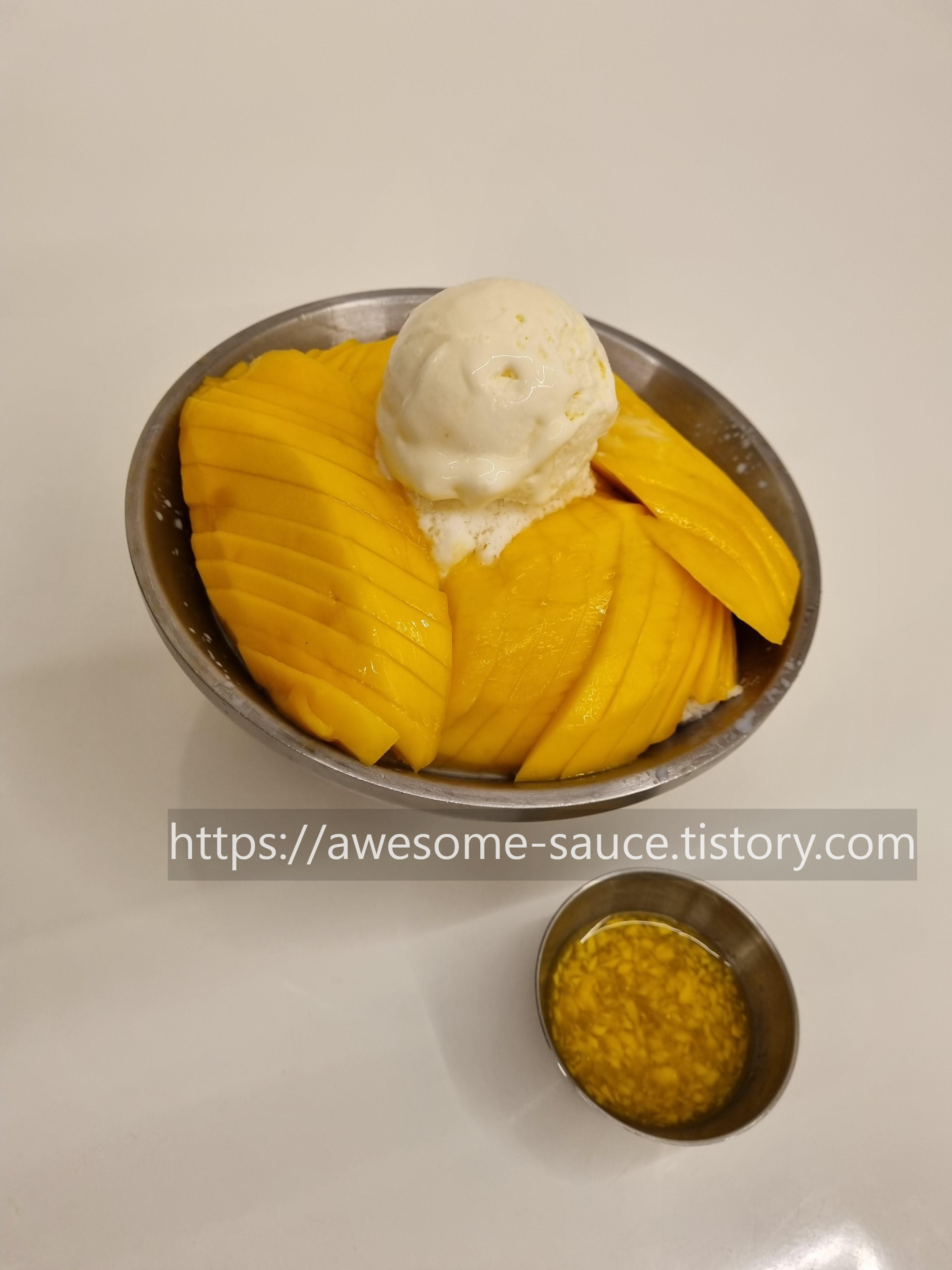 망고 먹고 얼음에 소스 부어서 먹었어요